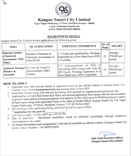 ksclkanpur[at]gmail[dot]com till date 25 Nov 2025 up to 05:00 PM.